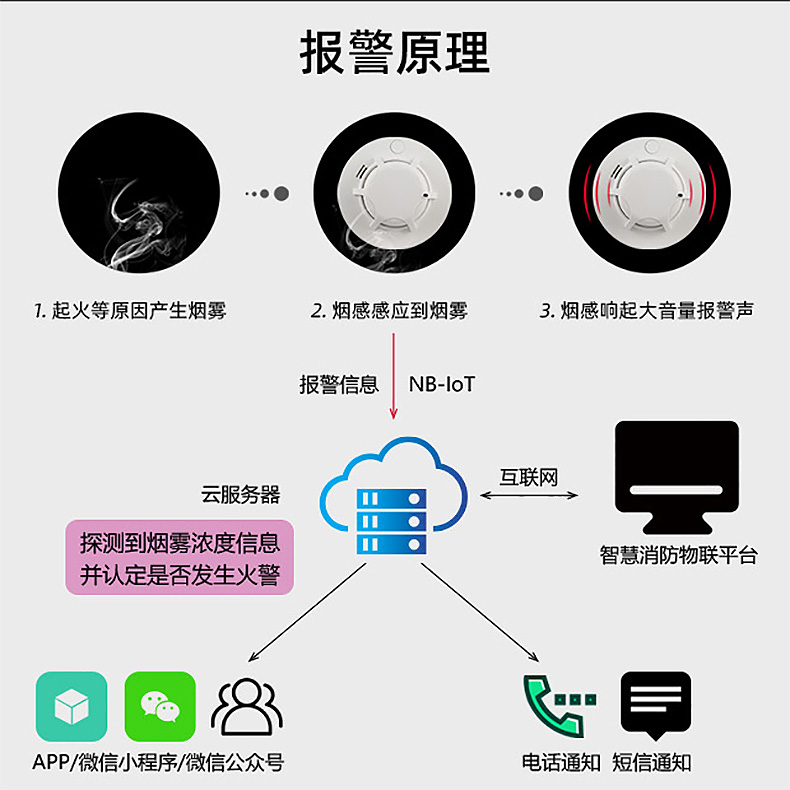 在物品易堆疊、少人員進(jìn)出或放置易燃物品的區(qū)域,比如儲(chǔ)藏間、廚房、堆滿紙箱的房間,可安裝驛通智能研發(fā)的NB-loT煙感報(bào)警器。內(nèi)置高性能進(jìn)口芯片,對(duì)環(huán)境煙霧具有極高的靈敏度,當(dāng)煙霧濃度達(dá)到0.11dB/m立刻觸發(fā)現(xiàn)場(chǎng)報(bào)警裝置,同時(shí)推送報(bào)警信息至管理后臺(tái)、手機(jī)APP、微信及手機(jī)短信,即使無(wú)人在現(xiàn)場(chǎng),也可以掌握對(duì)應(yīng)監(jiān)測(cè)區(qū)域的消防安全情況。