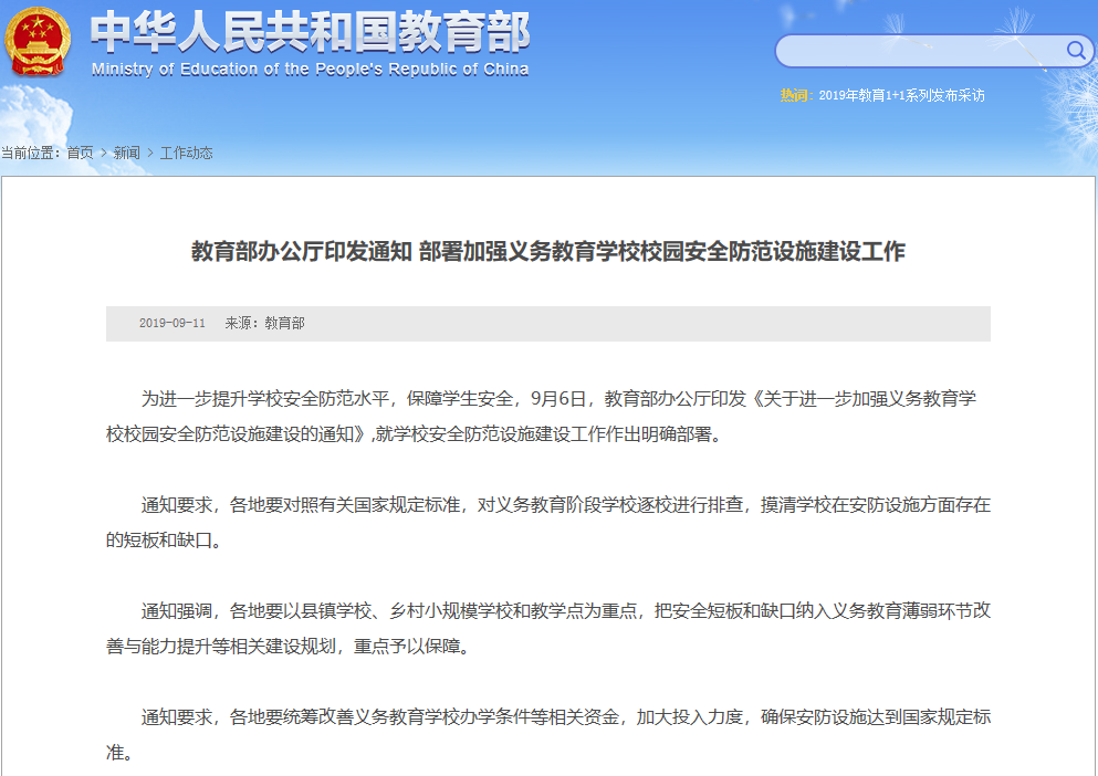 2019年9月2日,國(guó)務(wù)院教育督導(dǎo)委員會(huì)辦公室發(fā)出《關(guān)于進(jìn)一步加強(qiáng)中小學(xué)(幼兒園)安全工作的緊急通知》!各地教育部門要嚴(yán)格按照學(xué)校安全防范工作規(guī)范要求,為中小學(xué)和幼兒園配齊安保人員及必要的安全防護(hù)裝備器械,嚴(yán)格落實(shí)門衛(wèi)值守、內(nèi)部巡查等制度,嚴(yán)防無關(guān)人員和危險(xiǎn)物品進(jìn)入校園。門衛(wèi)不能成為擺設(shè),不合格、不發(fā)揮作用的要堅(jiān)決清理、更換。要大力推進(jìn)一鍵式緊急報(bào)警、視頻監(jiān)控系統(tǒng)與屬地公安機(jī)關(guān)聯(lián)網(wǎng)工作,確保實(shí)現(xiàn)一鍵報(bào)警,及時(shí)聯(lián)動(dòng)處置。