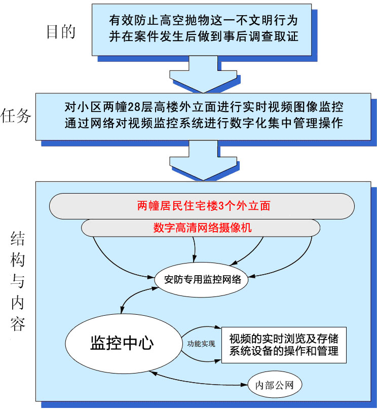 根據(jù)本次系統(tǒng)建設(shè)的框架和建設(shè)的思路,本次視頻監(jiān)控系統(tǒng)建設(shè)覆蓋小區(qū)內(nèi)兩幢28層高的居民住宅樓,覆蓋兩幢大樓的歌3個(gè)能夠發(fā)生高空拋物的監(jiān)控面。建成后的智能高清視頻監(jiān)控系統(tǒng)將能夠?qū)ψ≌瑯峭饬⒚孢M(jìn)行實(shí)時(shí)監(jiān)控及分析,形成統(tǒng)一的監(jiān)控網(wǎng)絡(luò),實(shí)現(xiàn)對(duì)大樓高空拋物事件的重點(diǎn)監(jiān)管。我們規(guī)劃建設(shè)一套完整的數(shù)字化、高清化的視頻監(jiān)控系統(tǒng),利用當(dāng)今成熟的數(shù)字視頻壓縮技術(shù)、多媒體技術(shù)、光纜傳輸技術(shù)、電視監(jiān)控技術(shù)、網(wǎng)絡(luò)技術(shù)等,構(gòu)建一套適合于整個(gè)項(xiàng)目的高空拋物防控體系。